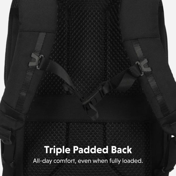 Phần đệm lưng và quai đeo được thiết kế theo ergonomics, giúp phân tán lực đều và giảm áp lực khi đeo lâu. Hệ thống thoáng khí hỗ trợ hạn chế nóng lưng, mang lại cảm giác thoải mái khi di chuyển đường dài.