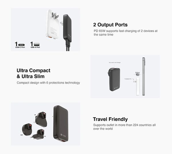 Với công suất tối đa 65W, tích hợp hai cổng sạc gồm một cổng USB-C và một cổng USB-A, sản phẩm mang lại khả năng sạc nhanh mạnh mẽ cho nhiều thiết bị cùng lúc như laptop, iPad, iPhone, Android, và phụ kiện di động khác.