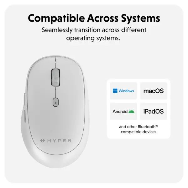 HyperSpace Bluetooth Mouse hỗ trợ kết nối qua Bluetooth, tương thích với nhiều hệ điều hành như Windows, macOS, iPadOS, Android… giúp bạn chuyển đổi dễ dàng giữa laptop, tablet và smartphone mà không cần dây cáp.