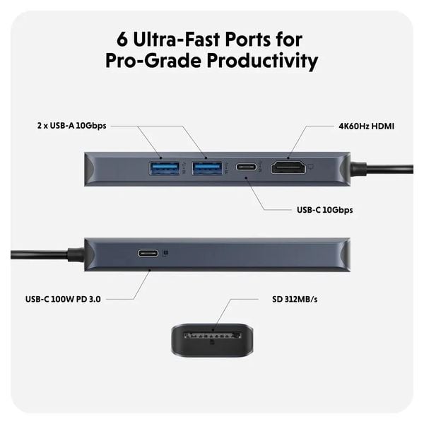 6 cổng đa nhiệm: HDMI, USB-A, USB-C và đầu đọc thẻ SD/MicroSD