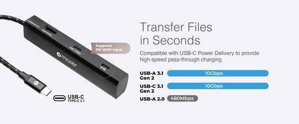 Cổng USB-C hỗ trợ Power Delivery giúp sạc thiết bị trong khi dùng hub. Hai cổng USB-A tốc độ cao (5Gbps) cho phép kết nối ngoại vi như USB flash, ổ cứng, bàn phím, chuột một cách nhanh chóng.