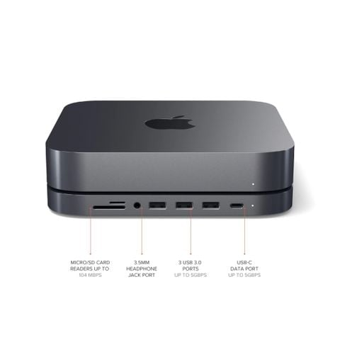 Đế kiêm Hub chuyển đổi Satechi Type-C Aluminum Stand cho Mac Mini có cổng dữ liệu USB-C, 3 cổng dữ liệu USB-A, đầu đọc thẻ micro/SD và cổng giắc cắm tai nghe 3,5 mm để truy cập thuận tiện vào các thiết bị ngoại vi thiết yếu của bạn.