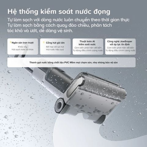 Roborock F25 tích hợp hợp hệ thống kiểm soát nước đọng thông minh, giúp ngăn chặn tình trạng nước dư làm trơn trượt sàn nhà. Dòng nước được luân chuyển theo thời gian thực, kết hợp với cơ chế xoay đảo chiều, thanh gạt nước bằng PVC mềm mại làm sạch nhẹ nhàng nhưng không kém phần triệt để. Đặc biệt, cổng hút gió lớn cùng chức năng hút nước dư hiệu quả giúp sàn nhà khô thoáng sau mỗi lần lau. Hệ thống này còn được trang bị thuật toán AI thông minh, giúp phát hiện và điều chỉnh lượng nước phù hợp cho từng loại vết bẩn.