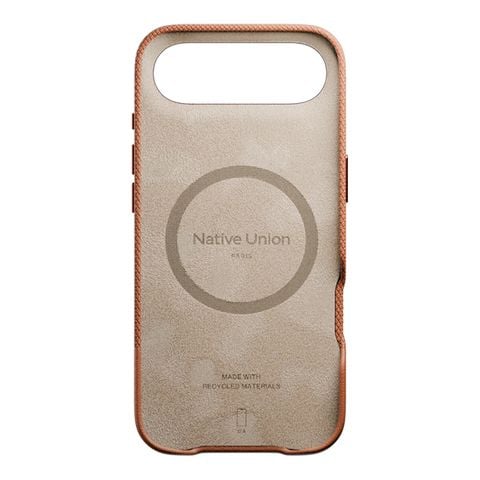 Ốp lưng (Re)Classic Case của Native Union được thiết kế dành riêng cho iPhone Air với sự kết hợp giữa vẻ ngoài cổ điển và vật liệu thân thiện với môi trường. Vật liệu chính là da nhân tạo không chứa sản phẩm từ động vật (animal-free leather alternative), kết cấu hai loại vân da — một mịn và một dạng vân “cross-grained” — tạo độ tương phản thú vị và cảm giác cao cấp khi cầm nắm. Khung bên ngoài được làm từ nhựa polycarbonate tái chế (recycled PC) và vật liệu tái chế khác, giúp giảm tác động lên môi trường.