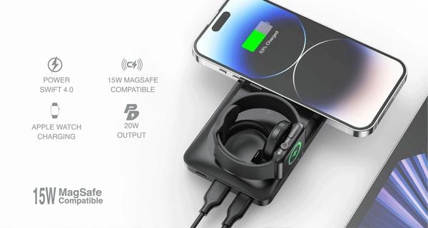 Bạn có thể sạc cùng lúc iPhone (qua MagSafe hoặc USB-C) và Apple Watch, rất thích hợp khi di chuyển.