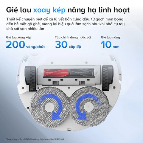 Roborock Q Revo 5AE được trang bị giẻ lau xoay kép nâng hạ linh hoạt, giúp tối ưu khả năng làm sạch trên mọi bề mặt. Với tốc độ quay 200 vòng/phút, giẻ lau có thể loại bỏ vết bẩn cứng đầu dễ dàng, mô phỏng hiệu quả như khi lau sàn bằng tay. Đặc biệt, mô-đun giẻ lau có thể nâng lên 10mm, giúp tránh làm ẩm thảm lông ngắn, bảo vệ bề mặt sàn tốt hơn. Ngoài ra, hệ thống tùy chỉnh 30 cấp độ lưu lượng nước cho phép điều chỉnh phù hợp với từng loại sàn và độ ẩm khác nhau, đảm bảo hiệu suất lau tối ưu. Nhờ tính năng này, Roborock Q Revo 5AE mang đến giải pháp vệ sinh toàn diện, giúp sàn nhà luôn sạch sẽ mà không cần can thiệp thủ công.