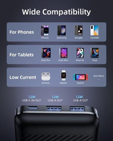 Tương thích rộng rãi: Pin sạc tương thích với hầu hết các thiết bị di động hiện nay, bao gồm điện thoại thông minh, máy tính bảng, tai nghe không dây và nhiều thiết bị khác.